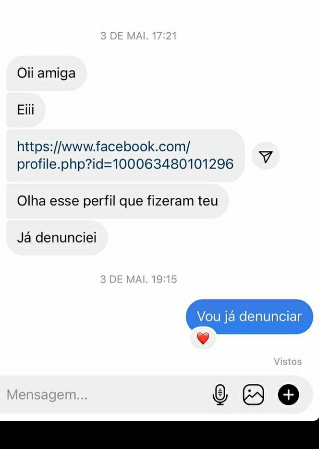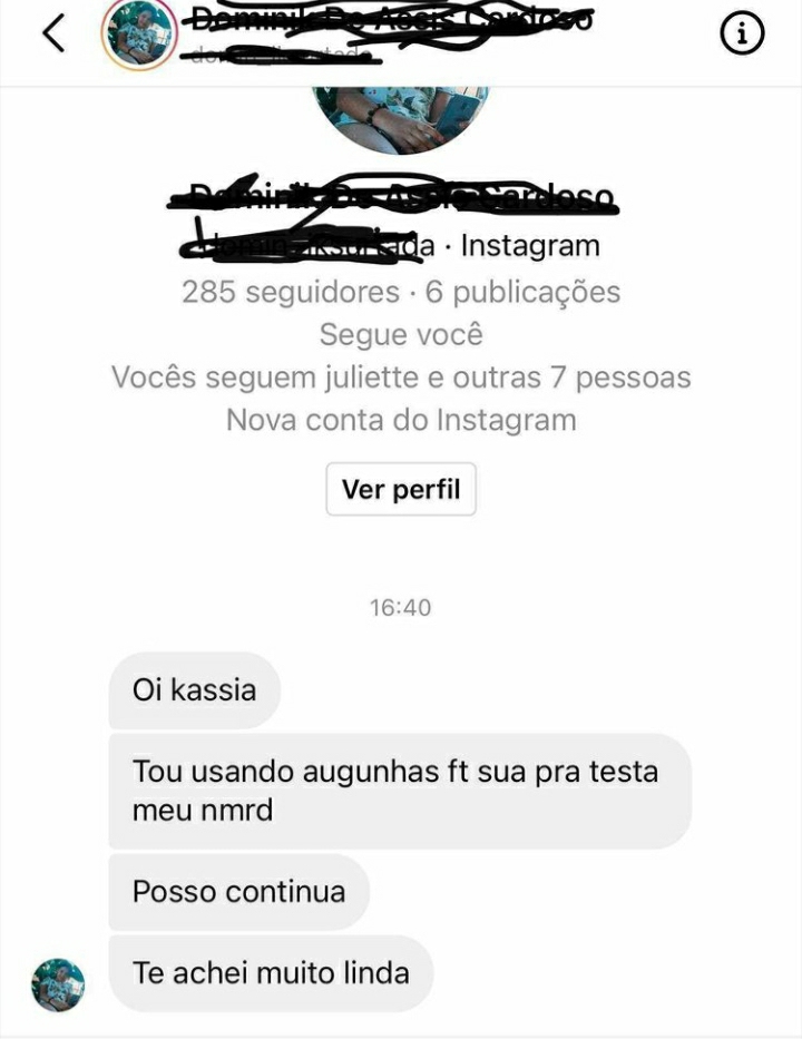 “Foi um senhor aqui no insta, me mandou msg dizendo que eu iria ver o que ele ia fazer, ele iria na delegacia se eu não devolvesse o dinheiro dele, aí ele até mandou o print da transferência que ele fez. Aí eu expliquei pra tudo sobre os fakes e ele mesmo assim não acreditava. Fiquei em choque, com medo, mas eu disse pra ele que ele poderia ir na delegacia, era um direito dele, mas que eu não podia fazer nada“