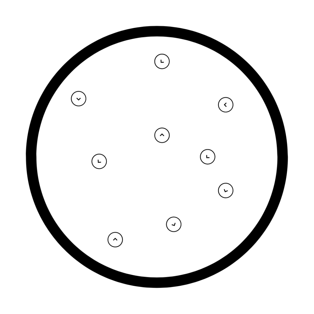 Mas não basta. Sociedade assim, parada? Nem pensar! Cada um desses pontinhos tem visões diferentes sobre como esse cercadinho deve funcionar, sobre como caminhar dentro desse cercadinho. Por isso, não são meros pontos, mas são pontos em movimento. Há uma seta vetorial em cada um desses pontos, por onde os seres se movem. A sociedade, assim, torna-se política, ou, em outras palavras, a política é a sociedade em movimento.