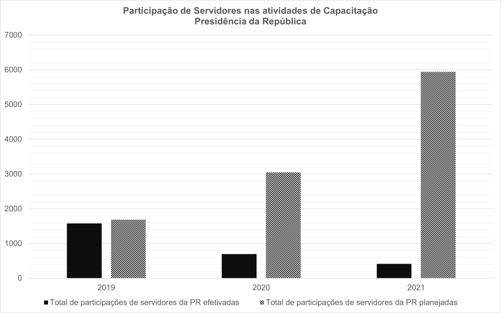 Para efeito de comparação, em 2017, durante o governo Temer, o orçamento autorizado era de R$1,071 milhão, do qual R$456 mil (42,5%) foi utilizado para capacitar 1.367 servidores de um planejamento de 2.000 (68% de aproveitamento). Em termos de execução do planejamento, apenas 2019 foi mais realista do que 2017.