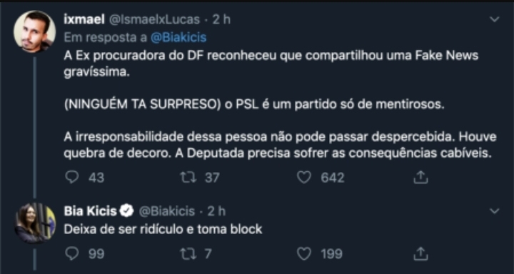 O vídeo em questão foi publicado pela deputada federal Bia Kicis (PSL-DF), que alegou ter recebido de “fonte muito respeitável”. A bolsonarista apagou a fakenews em seguida, dizendo “não compactuar com a mentira”. Na filmagem, três homens encapuzados – dois armados com fuzis e outro sentado falando – convocam luta armada, citando o ex-presidente Lula como “comandante”. Em seguida, ao ser repreendida por internautas, a deputada respondeu com ataques, dentre eles “deixa de ser ridículo e toma block”, a um deles que defendeu que Kicis “precisa sofrer as consequências cabíveis”.