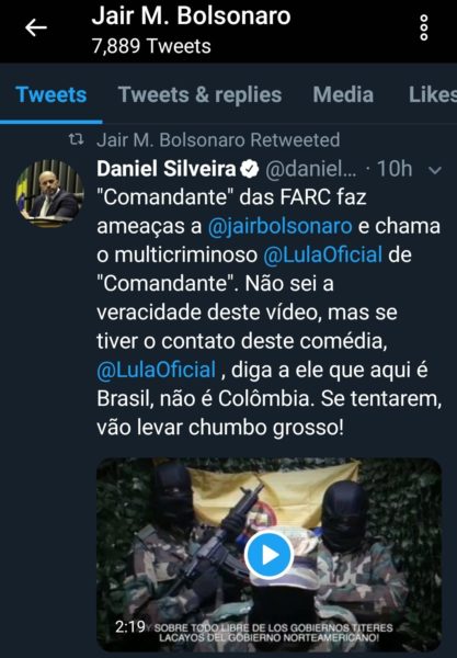 O bolsonarista Daniel Silveira (PSL-RJ) e o próprio Jair Bolsonaro também compartilharam o vídeo. Ex-deputado, já preso por atentados à democracia, confessou na própria postagem do vídeo que não conhecia “a veracidade”, mas em seguida mencionou Lula, pedindo que o mesmo entrasse em contato com o comandante das FARC transmitindo ameaças: “se tentarem, vão levar chumbo grosso”.