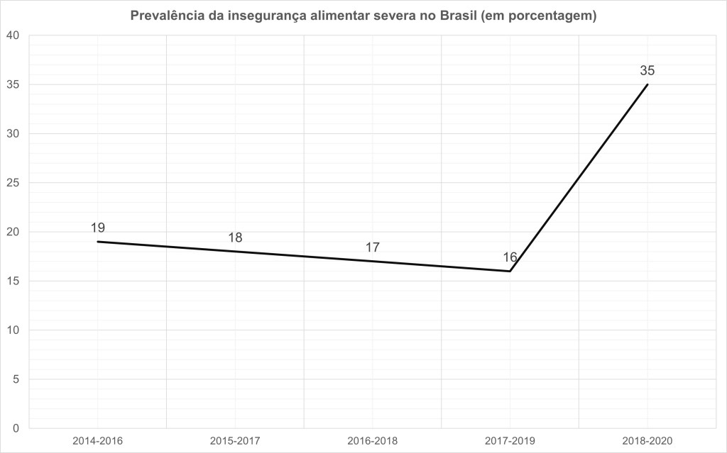 A Organização das Nações Unidas para a Alimentação e a Agricultura (FAO) estima que a insegurança alimentar moderada ou severa atinja 23,5% da população. A proporção subiu se compararmos a períodos anteriores, como o biênio 2014-2016, onde a estimativa falava em 18,3%. Atualmente, acredita-se que cerca de 7,5 milhões de brasileiros ficam sem comer por um dia ou mais.