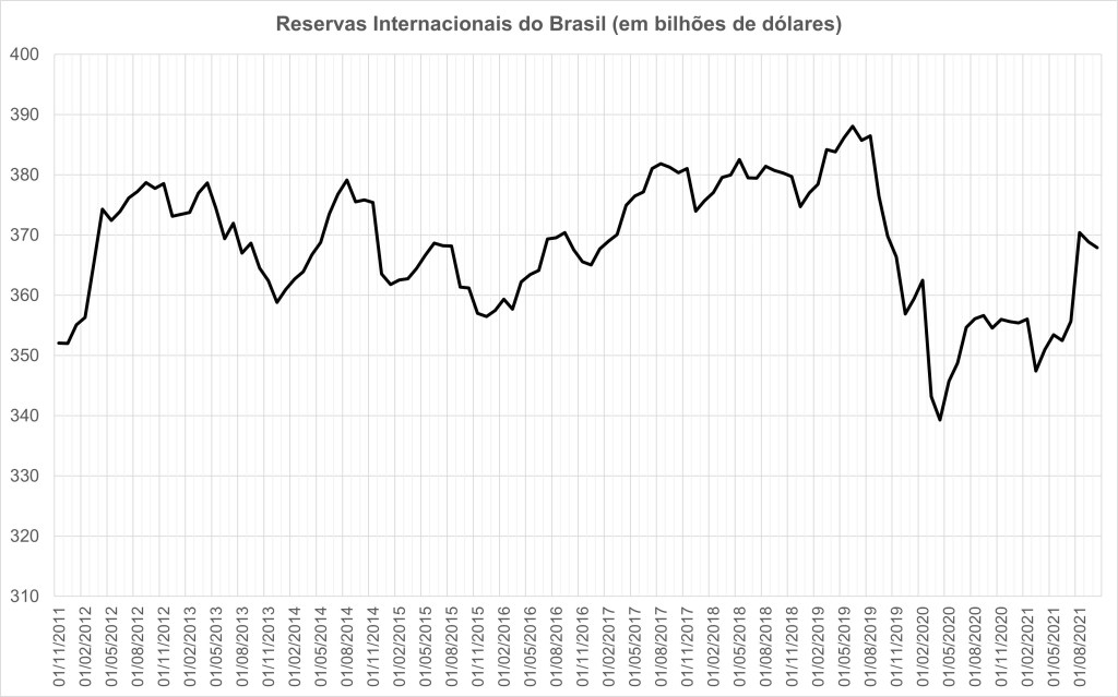 Assim como na alimentação, aqui a regra também é ter um pé-de-meia estratégico. As reservas internacionais do Brasil vêm se recuperando depois de uma forte queda em Abril de 2020: