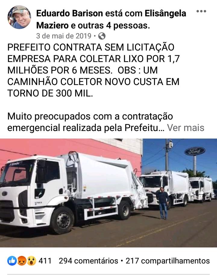 Difícil mesmo é sair da mentalidade da vaquinha, crendo que basta pagar e processar, e jamais agir em espírito de rigor para com os contratantes. Aliás, sobre a mentalidade da vaquinha, o próprio Eduardo Barison, em 2019 (ainda vereador), alertou para o fato de que um caminhão de coleta novo custaria R$ 300 mil reais. Muito bem pensado! Completo: empregaria diretamente através da prefeitura, sem terceirizações, garantindo a mais cidadãos do município direitos de um legítimo servidor público. Além do mais, é sempre um ganho ao povo ter mais patrimônio, sob o qual todos temos parte e poder de opinar.