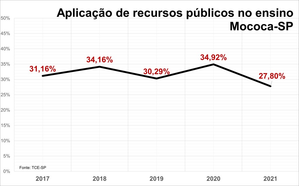 Responsabilidade fiscal sob tensão. O Tribunal de Contas do Estado de São Paulo alertou a prefeitura municipal de Mococa para o descumprimento do dever de aplicar pelo menos 25% de sua receita em educação. O montante ficou em apenas 20,45%, pouco menos de R$8 milhões, para um total de R$38,18 milhões arrecadados.