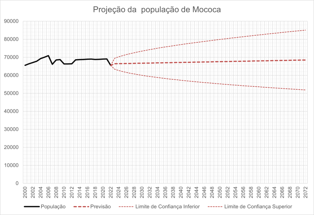 A estimativa nos mostra que em 2072 teremos cerca de 68.500 pessoas vivendo em Mococa. A margem de erro leva, pra cima, a 85.104 e, pra baixo, a 51.896. Com a natalidade decrescendo e o dobro de casas em relação a agora, em 2060 a regra serão pessoas morando sozinhas.