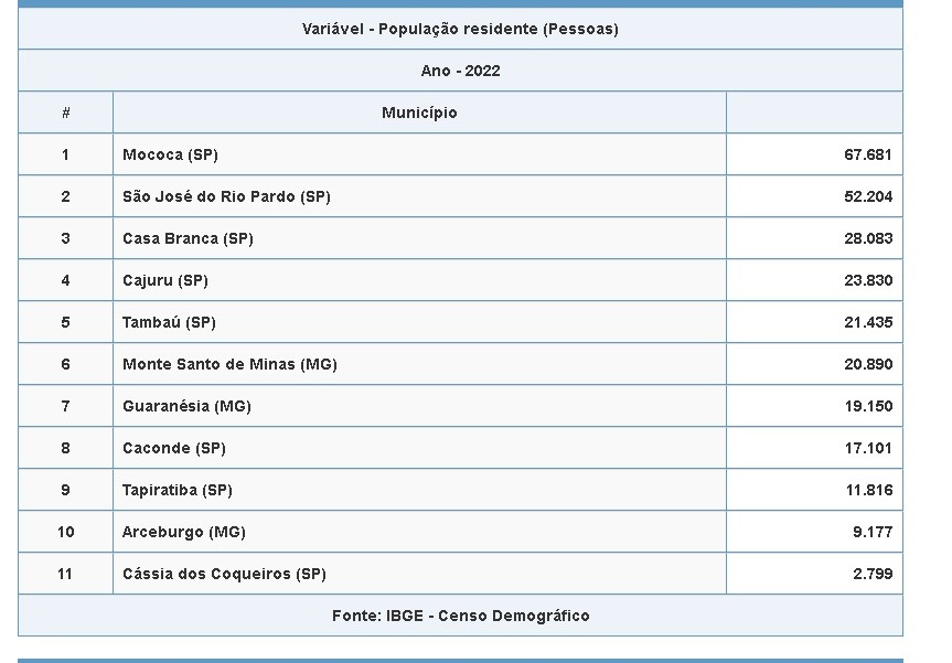 Tirando Guaranésia, que viu sua população crescer em 0,19%, e a pequena Cássia dos coqueiros, que segue de perto o padrão nacional – +0,51%, ou 165 habitantes, nossos 0,17% estão acima da média da região📈. Arcerburgo, por exemplo, viu sua população cair em 0,30% em relação a 2010, somando, hoje, 9.177 pessoas. O maior êxodo foi em Tapiratiba, que perdeu 921 pessoas, decréscimo de 0,62%.📉