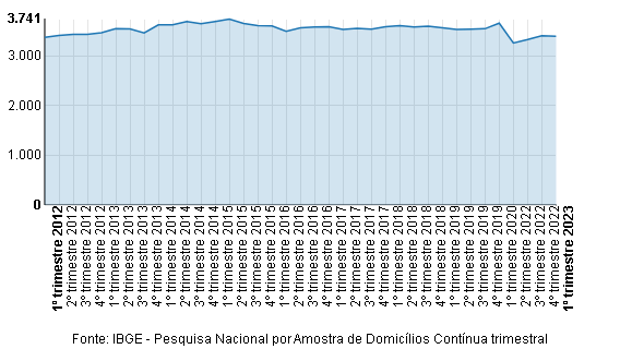 💸E os ganhos também despencaram: do início da pandemia até o meio de 2022, o rencimento médio da população do estado, até então estável, caiu quase 11%. AInda não nos recuperamos: juntos, já estávamos beirando a marca de $3.700 por pessoa. Agora, tentamos voltar ao patamar de $3.400. A queda no gráfico é patente a olho nu: