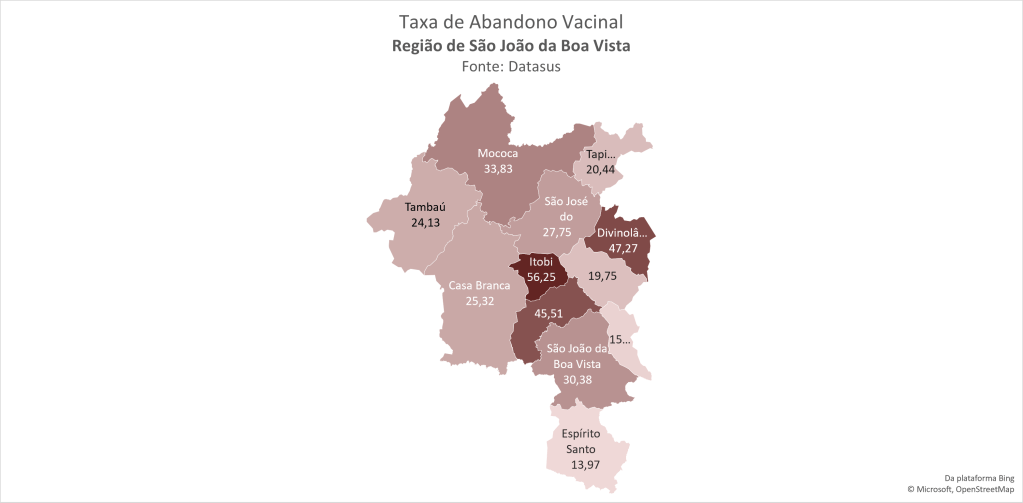 🗺🧭Comparando, vemos que Mococa é a quarta cidade com maior taxa de abandono vacinal, ranking em que Itobi lidera, com 56,25%, e Espirito Santo do Pinhal dá exemplo, com 13,97% de abandono.