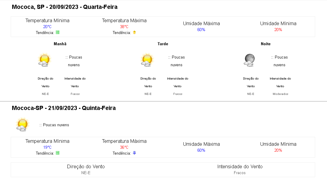 Onda de calor. O Instituto Nacional de Meteorologia (INMET) indica que o pico de temperatura durante o alerta laranja que passa por Mococa deve ser amanhã, 20, quando os termômetros podem chegar aos 38ºC ou mais. ☀ Hoje, a temperatura mais alta foi registrada em Balsas-MA: 40,3 ºC.
